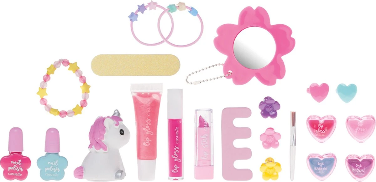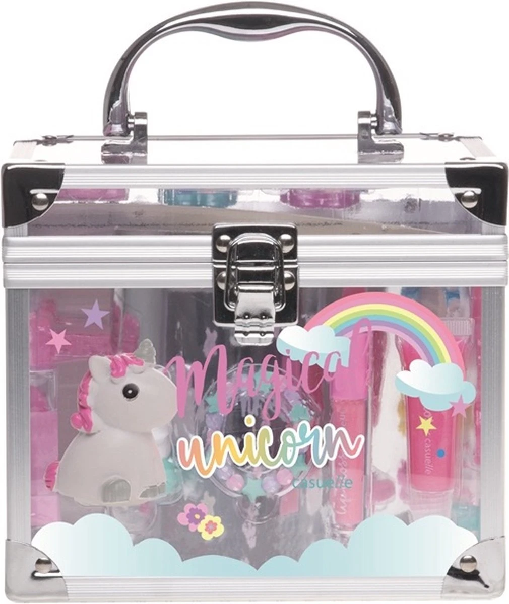 Met deze prachtige Unicorn make-up koffer van Casuelle kom jij nooit meer make-up te kort! In de make-up koffer zit een zeer uitgebreide make-up set met onder andere twee nagellakjes op waterbasis, een spiegel, twee haarelastiekjes, lippenstift, lipgloss en nog veel meer. Je kunt de make-up koffer gemakkelijk overal mee naartoe nemen, zoals op vakantie of naar school, zodat jij er overal op en top uit zal zien!
