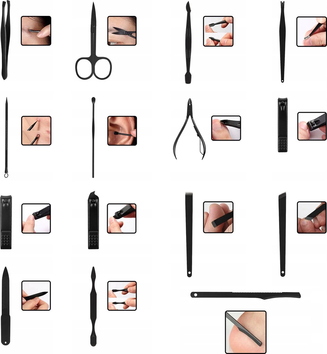 De complete set bestaat uit 15 verschillende tools waaronder een kleine- en grote nagelknipper, pincet, trimmer, schaar, vijl en reinigingsmesjes. Naast een complete nagelverzorging is de set ook te gebruiken bij het epileren van kleine haartjes, het afwerken van de randjes bij een baard en andere handelingen voor de algehele verzorging. Ideaal voor thuis, op reis en in elke professionele omgeving!