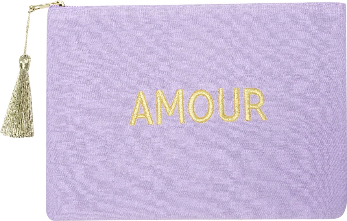 Met dit leuke tasje zorg jij ervoor dat al jouw spulletjes in een leuke tasje zitten. Het tasje is stevig en van zacht katoen. Dit is tasje ideaal om zowel je make-up spulletjes als je sieraden netjes en veilig in op te bergen. Het tasje is lila van kleur en heeft een gele geborduurde opdruk met het woord AMOUR en een leuk kwastje aan de rits.