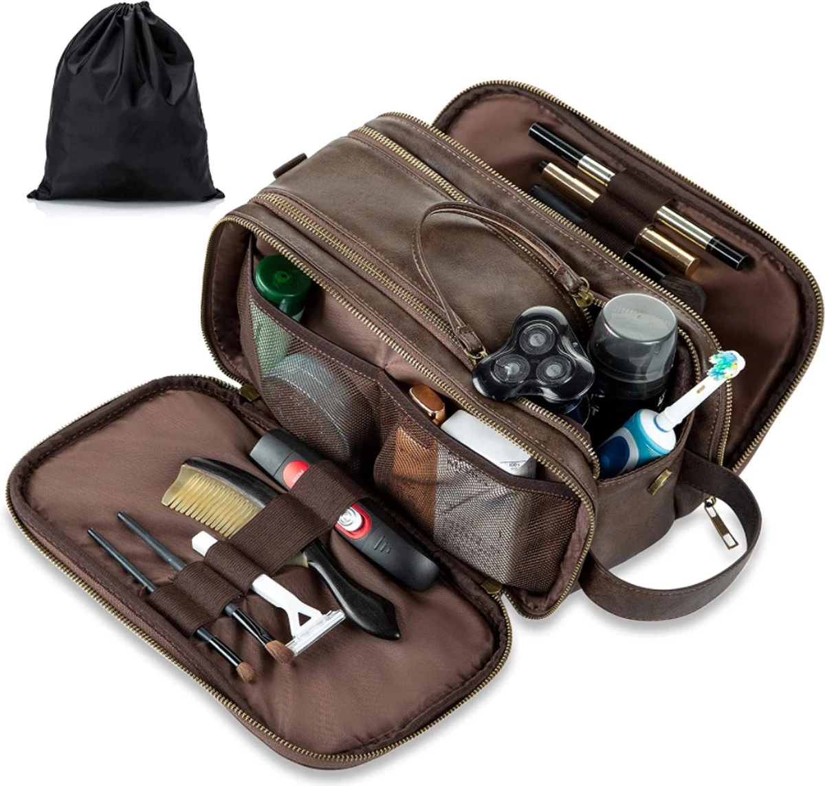 Merkloos Waterbestendige Lederen Toilettas Voor Mannen Grote Reistas Scheren Dopp Kit Badkamer Gym Toiletten Make-up Organizer Met Gratis Natte Droge Tas