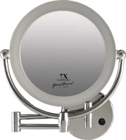 Strakke en uiterst stevige metalen wand spiegel die voorzien is van LED. De LED verlichting maakt deze spiegel niet alleen energie zuinig maar geeft ook nog eens een helder wit daglicht af, hierdoor kunt u zich perfect opmaken, epileren, scheren, haar doen of uw lenzen inbrengen. Ook beschikt de spiegel over een handige knik arm zodat u de spiegel naar u toe kunt halen, hierdoor heeft u een uiterst luxe hotelkamer spiegel voor bijvoorbeeld in de badkamer. De spiegel werkt op 4 AA batterijen of is te gebruiken met de USB stroomkabel, beiden worden meegeleverd. Met de stroomkabel kan de spiegel van stroom voorzien worden dat is extra handig als deze op een vaste plek komt te hangen, echter laad deze de batterijen niet op! De spiegel is aan beide zijden te gebruiken, met aan de ene zijde een normale vergroting en aan de andere zijde een 7x vergroting. U kunt de spiegel zelf roteren zodat u makkelijk kunt switchen tussen de normale en de vergrotende kant. De spiegel heeft een doorsnee van 22cm.