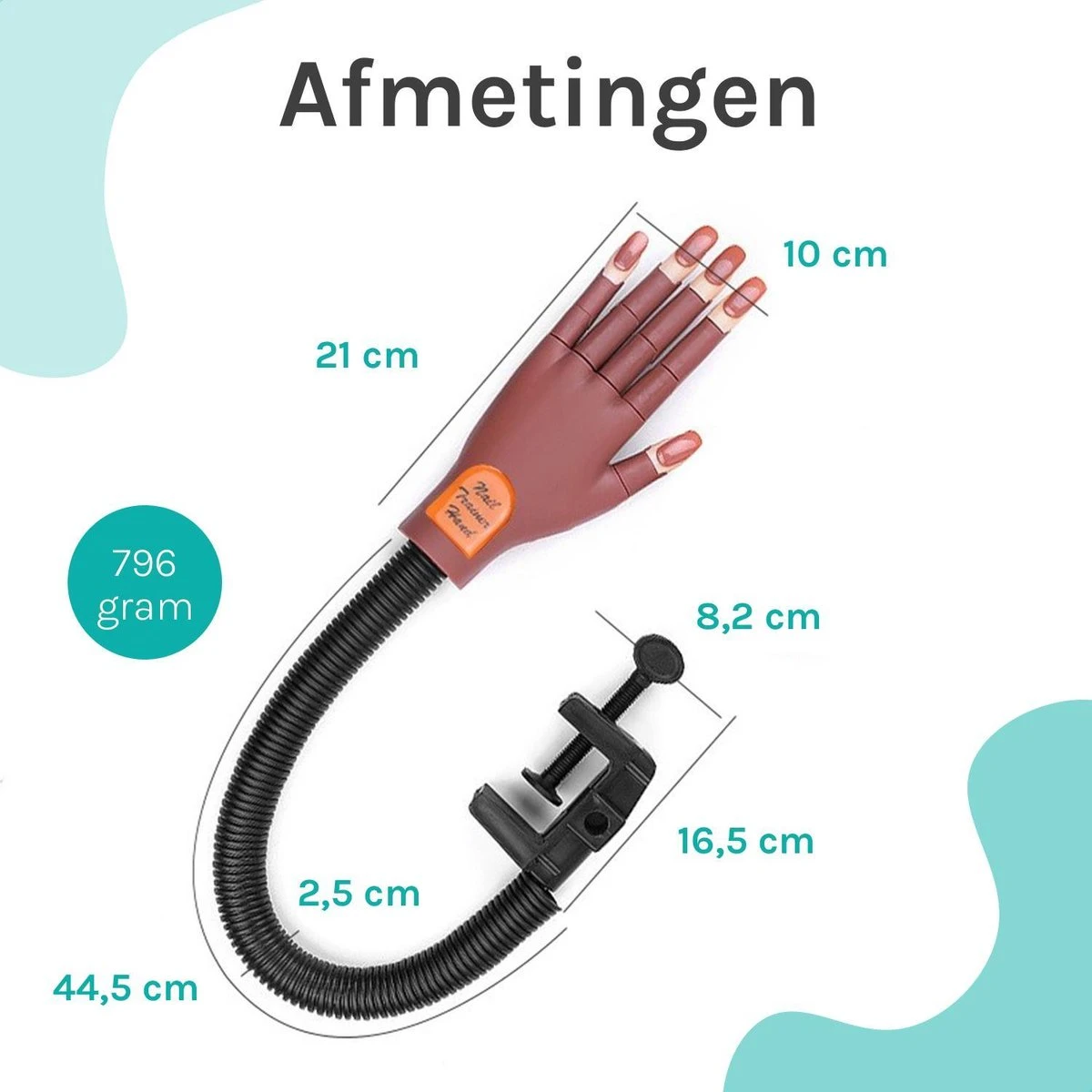 De oefenhand kun je door middel van de verstelbare klem aan je tafel bevestigen. De vingers zijn volledig buigbaar.