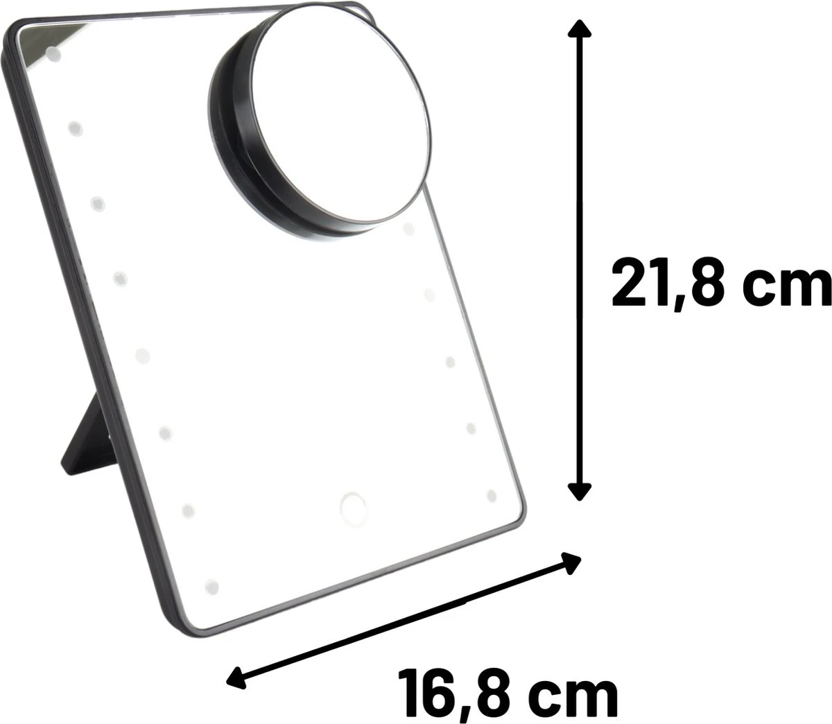 Breng je make-up perfect aan met de Orange85 Make-up Spiegel met Verlichting Zwart. Deze spiegel is voorzien van 16 LED-lichtjes waardoor je je eigen gezicht perfect kan zien. Zeer geschikt om kleine haartjes te verwijderen. De spiegel is voorzien van een klein spiegeltje die drie keer vergroot. De afmetingen zijn 21.8 x 16.8 x 0.5 cm.