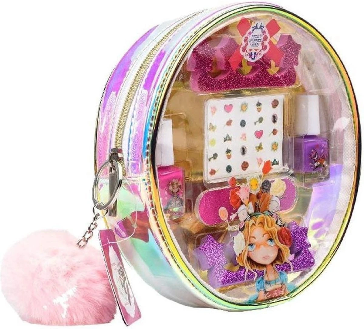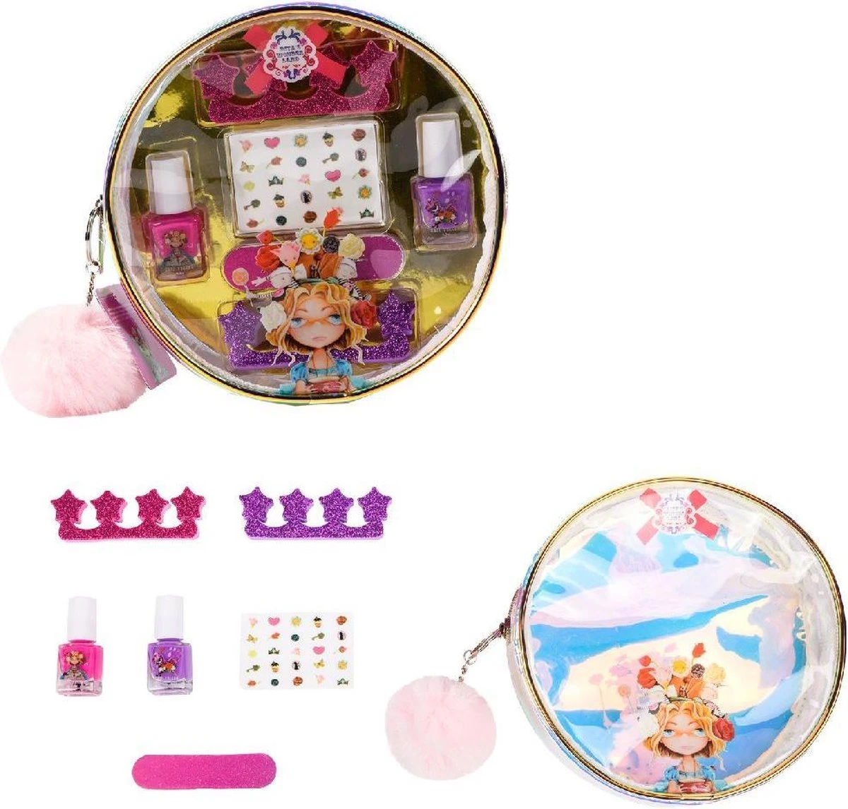 Dit leuke make-up tasje bevat alles wat je nodig hebt om je nagels mooi te lakken! Het tasje bevat twee teenspreiders, een potje nagellak in het roze en een potje nagellak in het paars, een vijltje en vel nagelstickers. Laat jouw nagels stralen!