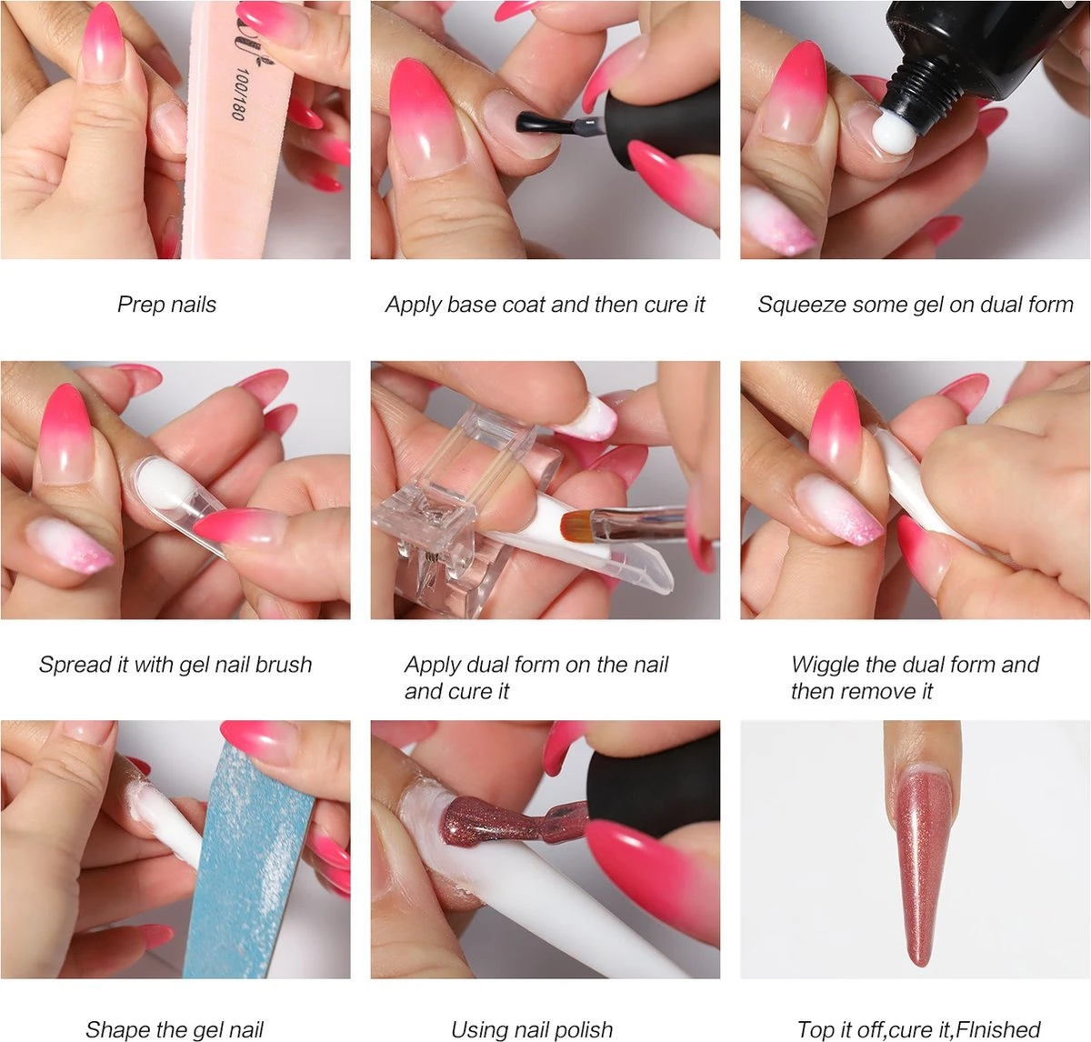 Zoek de form uit die helemaal over je nagel past. Breng dan de polygel, acrylgel of acryl aan in de form en breng deze aan op de nagel. De forms zijn voorzien van “maatstreepjes” zodat wanneer je niet de gehele lengte van de inhoud vd form wilt overzetten op je nagels je voor alle nagels snel en eenvoudig dezelfde verhouding kunt toepassen. Als je voor de gehele Form lengte gaat dan is dit voor jou overbodig. Je kunt dus zelf de lengte bepalen. Het werkt het soepelste als je bij de nagelriemen begint en de form daarna langzaam naar de nagels aandrukt. Verwijder nu het evt teveel opgebrachte materiaal die aan de zijkant van de form uitkomt. Als de polygel of acryl eenmaal uitgehard is, is dit een stuk lastiger. Hou de forms op de plaats tot de acryl gel of polygel uitgehard is. Gebruik hier een LED/UV lamp speciaal voor nagels voor, haal nu de form van de nagel en viola, u heeft een sierlijke kunstnagel! En de form kunt u natuurlijk gewoon hergebruiken, reinigen met 70% alcohol.